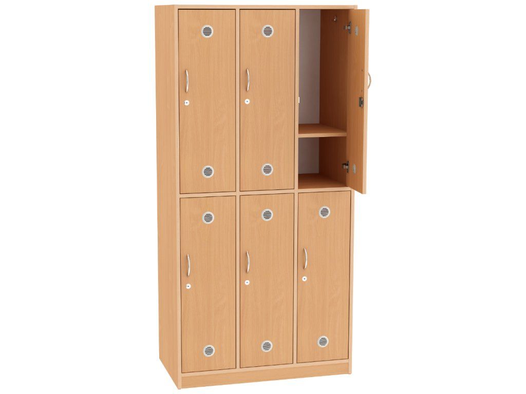 Skříň je rozdělena do šesti samostatných uzamykatelných oddílů, které umožňují bezpečné uložení osobních věcí více uživatelů.