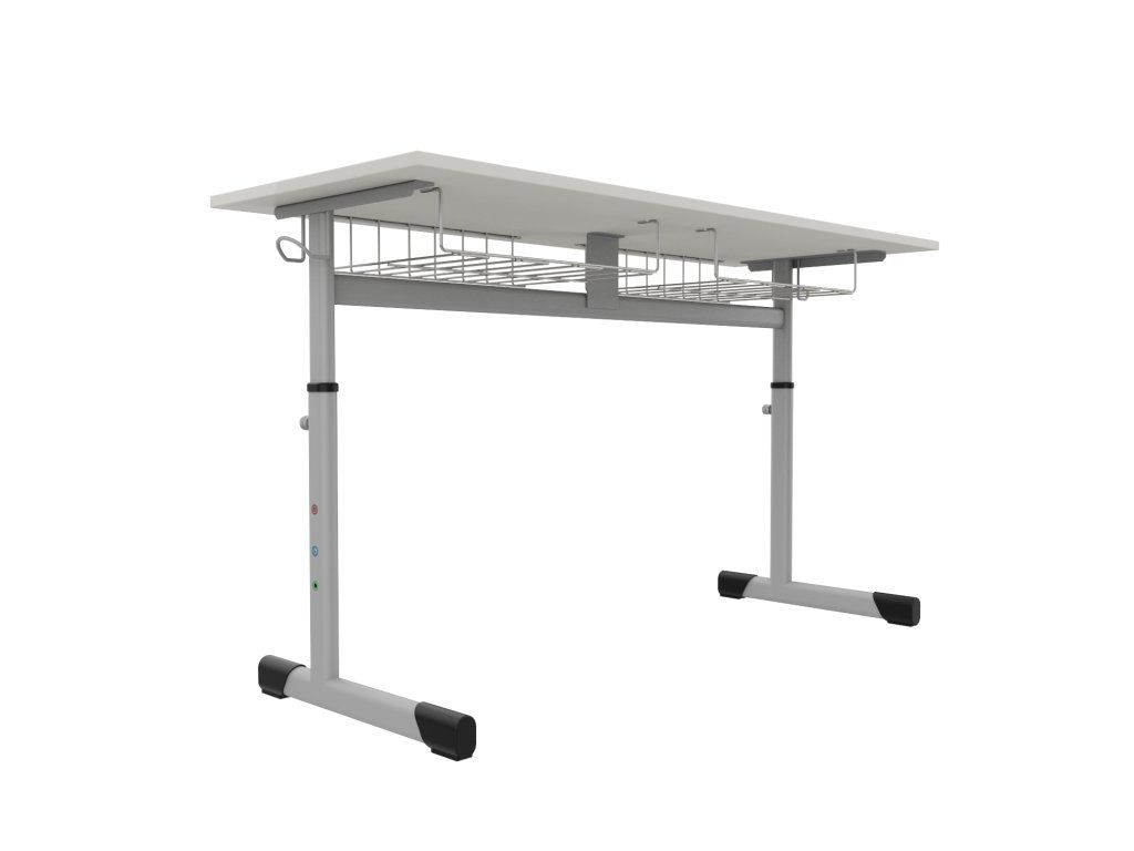 Pod pracovní deskou jsou umístěny dva drátěné koše, které poskytují praktický úložný prostor pro učebnice, sešity a další školní potřeby.