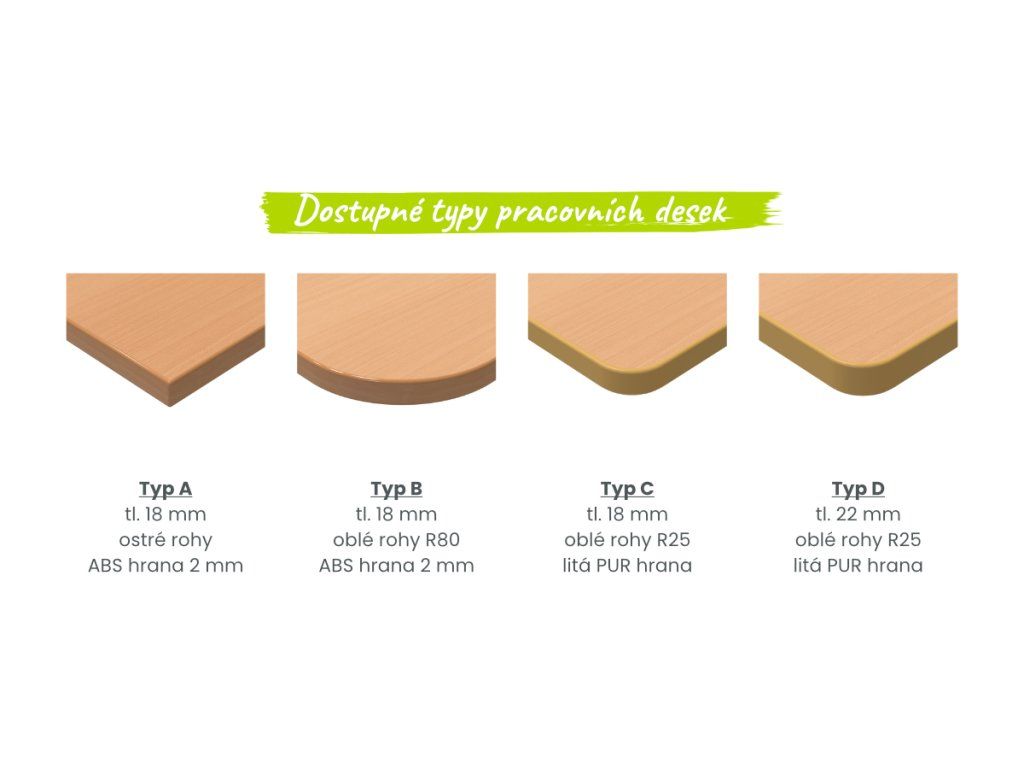Typ pracovní desky: TYP A (tl. 18 mm, ostrý roh, ABS hrana 2 mm) nebo příplatkové varianty TYP B, TYP C a TYP D