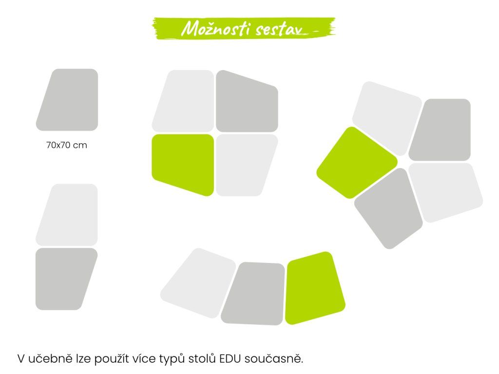 Školní stůl EDU Flex je navržen pro moderní způsob výuky, který kombinuje frontální výuku, skupinovou práci i samostatná cvičení. Asymetrický tvar pracovní desky o rozměru 70 × 70 cm umožňuje vytvářet různé sestavy stolů a snadno přizpůsobit uspořádání učebny aktuálním potřebám výuky.