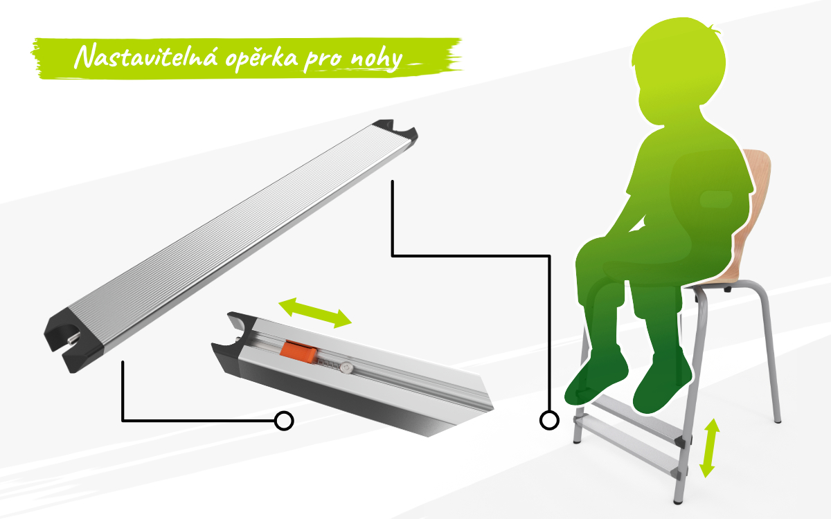 Významným prvkem tohoto modelu je nastavitelná opěrka pro nohy, vyrobená z hliníkového profilu. Stabilní uchycení zajišťují plastové koncovky a kovové čepy. Spodní část profilu obsahuje posuvný mechanismus, umožňující rychlé nastavení jednotlivých výškových stupňů. Ovládání je intuitivní a přizpůsobené i mladším uživatelům.