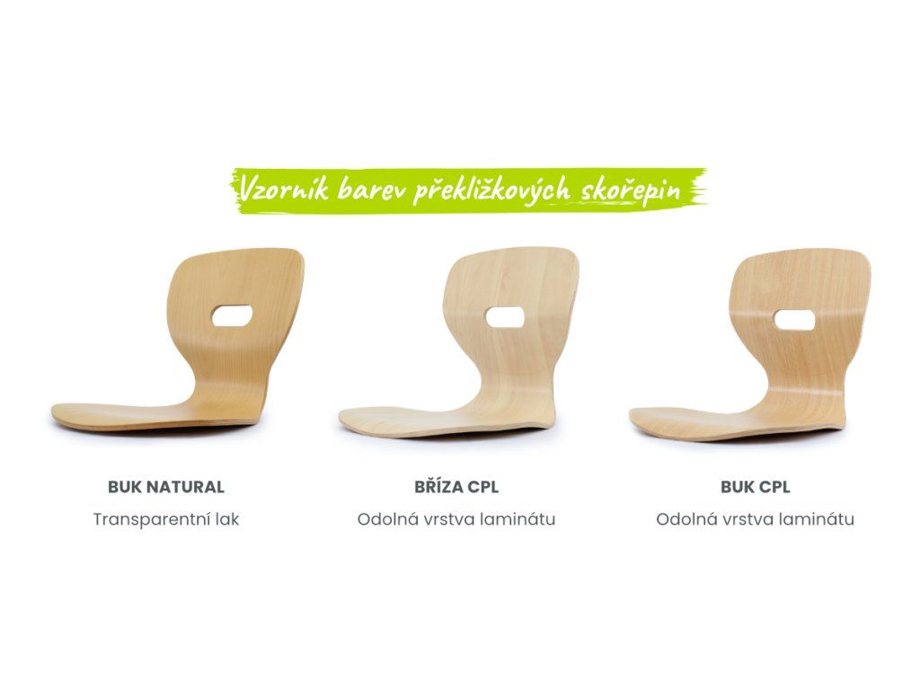 Skořepina je vyrobena z 10mm silné bukové překližky opatřené ochrannou transparentní vrstvou laku. Ta chrání povrch před opotřebením a zároveň zachovává přirozený vzhled dřeva. Ergonomické 3D tvarování podporuje správné držení těla a přispívá k pohodlnému sezení, zejména v oblasti beder. Alternativou lakovanému povrchu je odolnější CPL laminát, který nabízíme v dekorech Buk a Bříza.